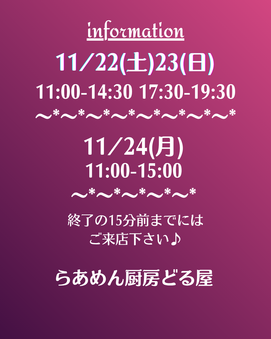 この3連休、11/22.23は昼夜営業いたしますが、11/24は月曜日なので昼のみ営業になります。