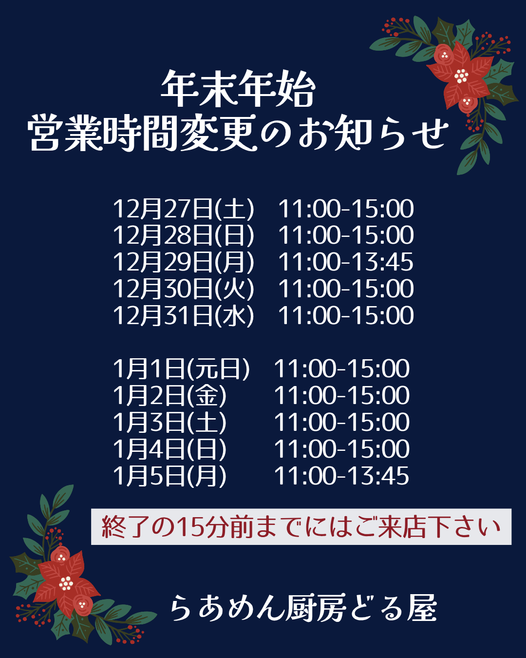年末年始のお知らせのページを作りましたので、ご来店の際はこちらをご確認いたたけると幸いです。